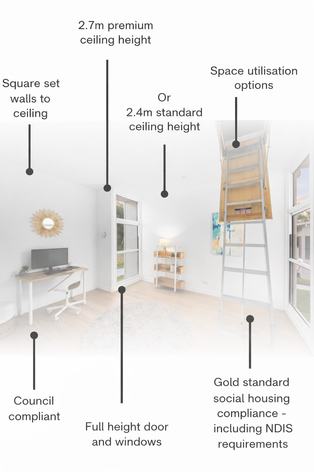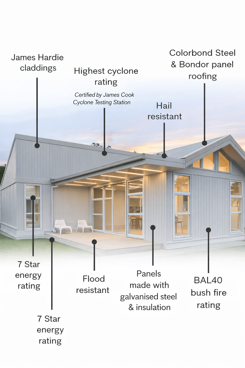 Built to meet strict Australian standards, including energy efficiency, bushfire (BAL ratings), flood and cyclone resistance — with consistent, high-quality construction.
